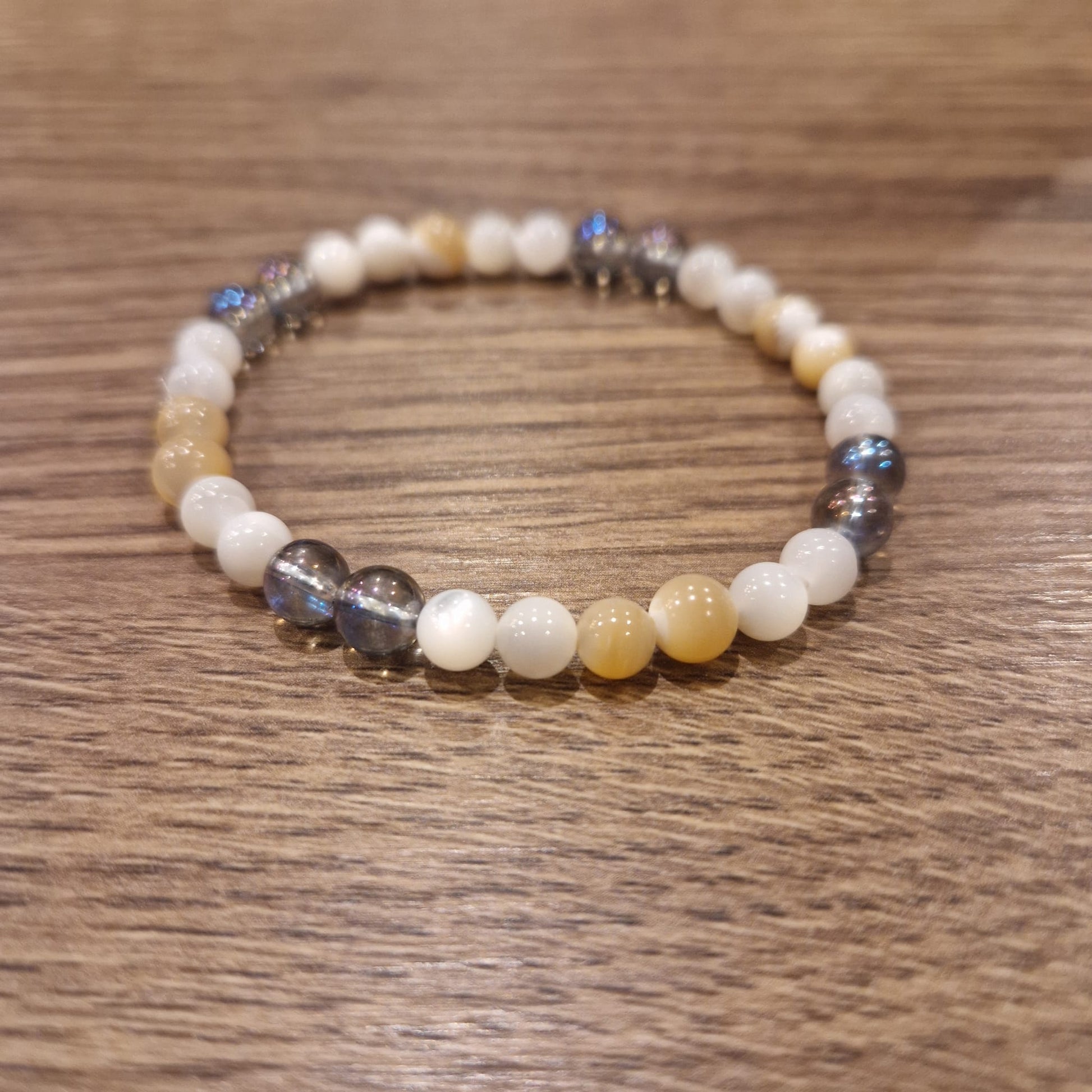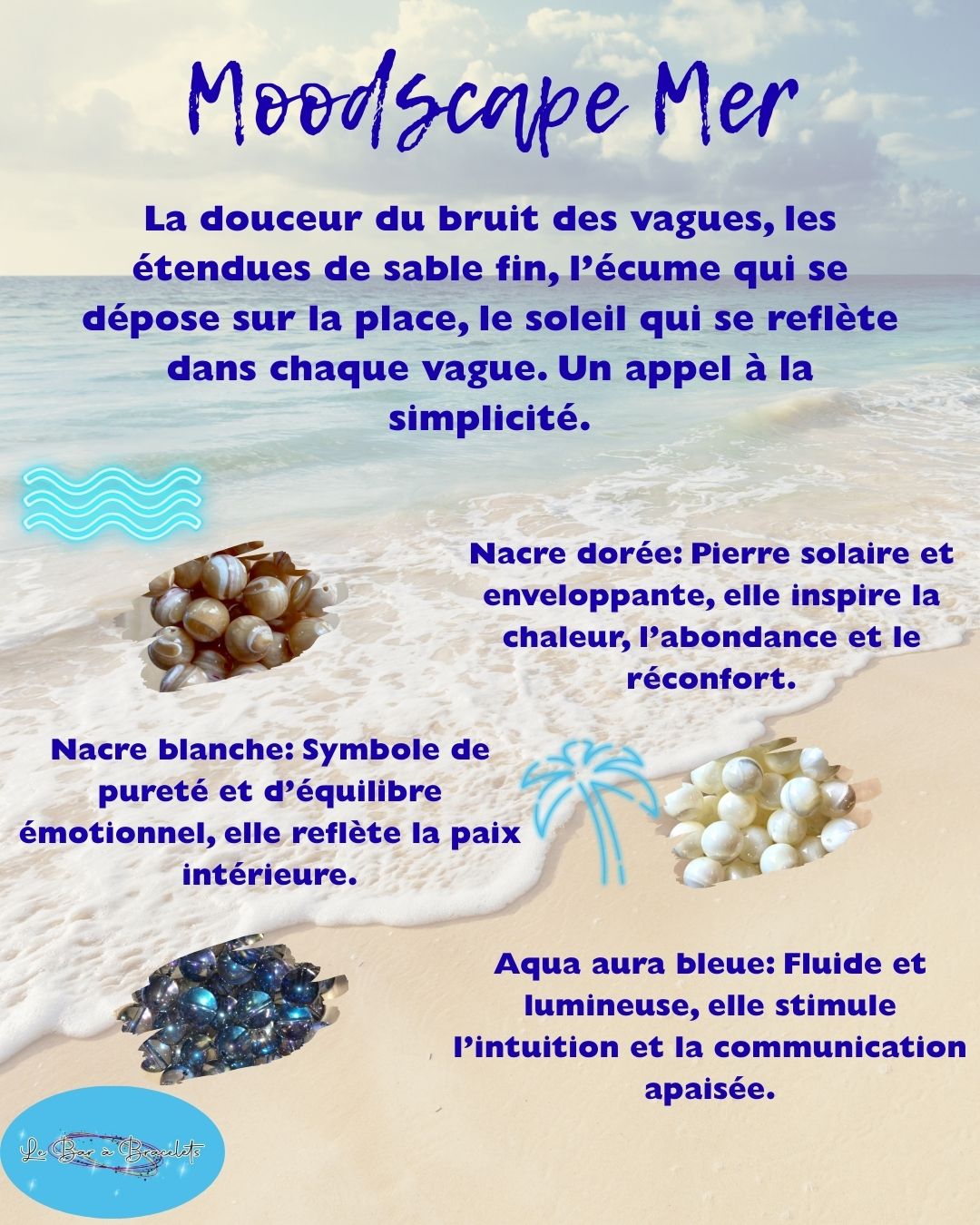 Moodscape t’invite à plonger dans la Mer : un bracelet frais et lumineux, entre sable doré, écume blanche et profondeur des vagues. Une ode à la fluidité et à l’intuition.