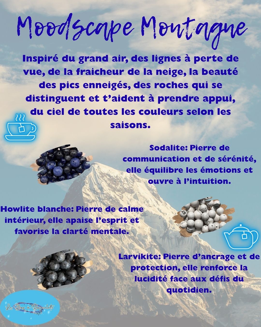 Moodscape t’élève en Montagne : un bracelet ancré et apaisant, où se mêlent la blancheur des neiges, la force des rochers et la profondeur des glaciers.
